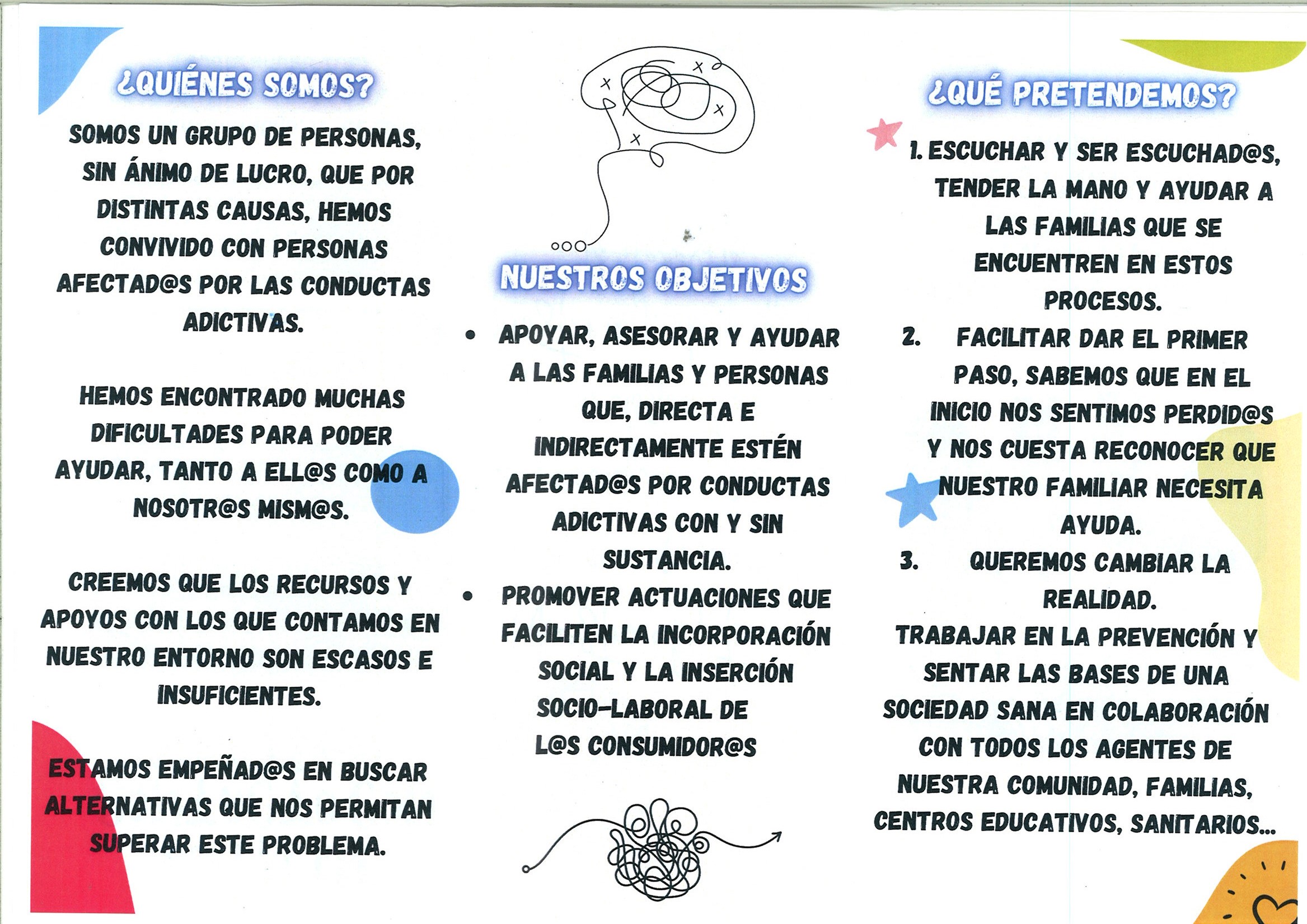Los objetivos de esta Asociación es apoyar, asesorar y ayudar a las familias y personas que, directa e indirectamente estén afectados por conductas adictivas con y sin sustancias. A su vez promueven y facilitan la incorporación social y la inserción socio-laboral.